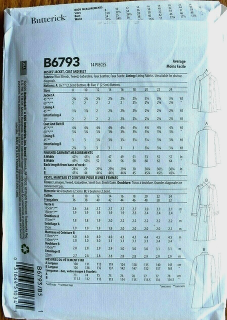 Butterick Pattern 6793 Coat Jacket Misses Sizes 8 10 12 14 16 Uncut For Sale Online Ebay